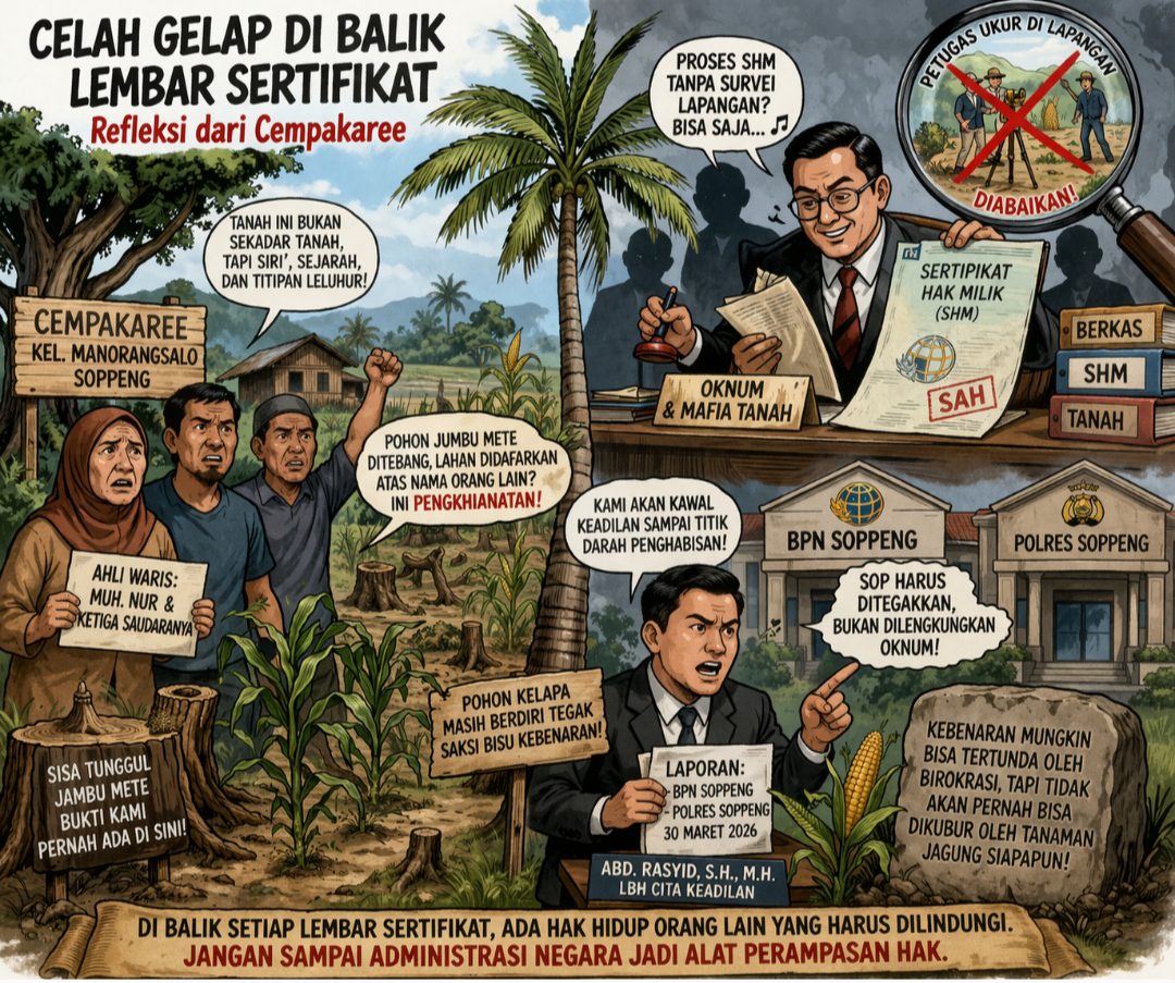 Langkah Muh. Nur Cs yang kini menggandeng advokat Abd. Rasyid, S.H., M.H., dari LBH Cita Keadilan, menandai dimulainya babak pembuktian. Laporan yang kini mendekam di meja BPN dan Polres Soppeng adalah ujian integritas bagi para pemangku kebijakan di bumi Latemmamala. Surat Muh. Nur Cs ini, masuk Kantor BPN Soppeng sejak 30 Maret 2026, begitu pun ke Polres Soppeng.